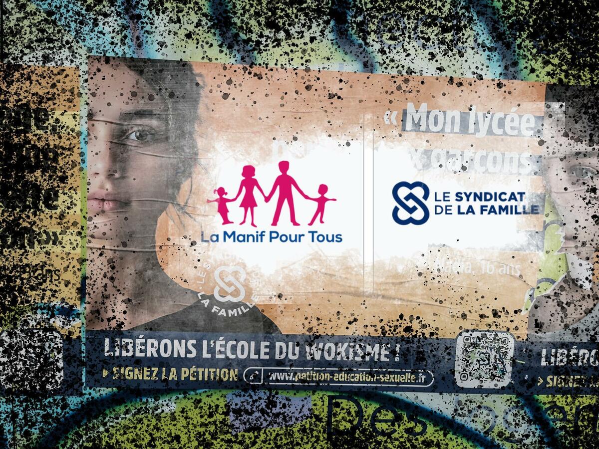 Dix ans après les grandes manifestations contre le mariage pour tous, en 2023, le mouvement La Manif pour tous s’est mué en une nouvelle structure : le Syndicat de la Famille. Cette année, à la rentrée, ce collectif qui diffuse des contenus homophobeset transphobes a pu coller des affiches, parfois sauvages, dans plusieurs villes de France sans être inquiété.