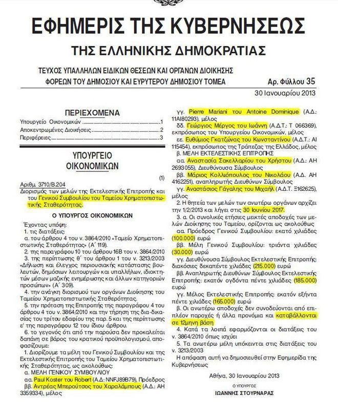 L'histoire démarre donc en Grèce le 30 janvier dernier. Dans le Journal Officiel local. On y apprend que les six personnes du board du Fonds de stabilité grec (qui gère la restructuration des banques du pays) se partagent 785.000 euros annuels en salaire.