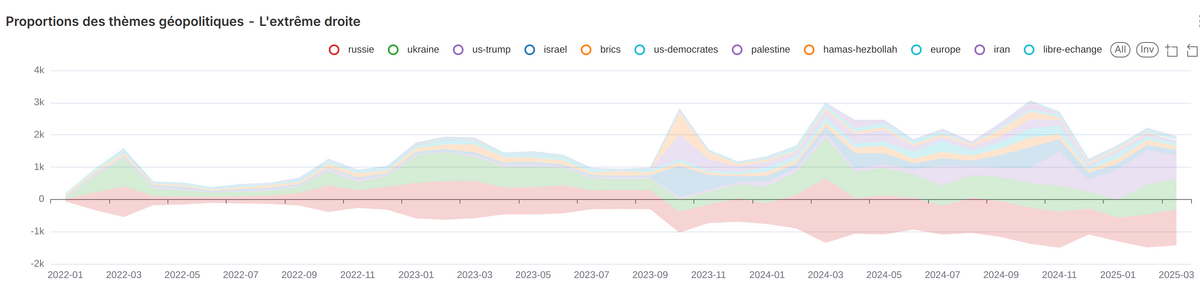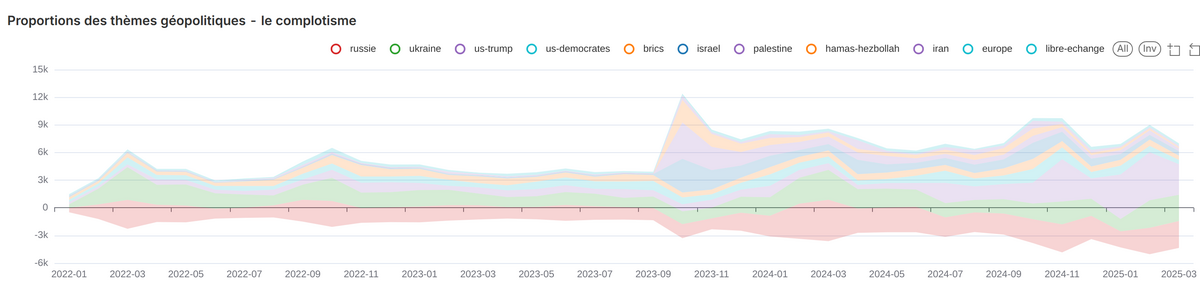 En comparant les courbes de l’extrême droite et du complotisme, mais cette fois-ci sur les thématiques internationales, le phénomène se reproduit : les courbes et la prévalence des thématiques semblent pratiquement identiques. En pôle position, la guerre en Ukraine puis l'importation, à la mi-2024, de thématiques nord-américaines liés à l'essor de Trump.