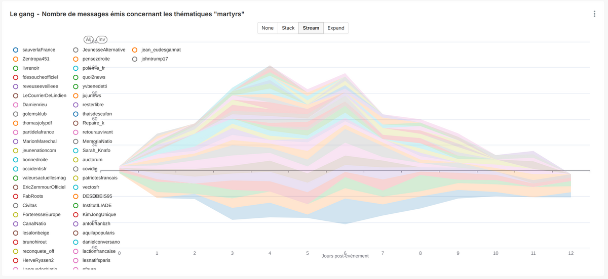 La vague commence le lendemain de l’évènement par un message du fil « néofasciste » « fdesoucheofficiel ». Le lendemain, l’information commence a être reprise et les fils politiques sont au cœur de la danse avec plus la moitié des reprises par « EricZemmourOfficiel », « dupontaignan », « MarionMarechal », « reconquete_off » et l’influenceur d’extrême droite « DamienRieu ».