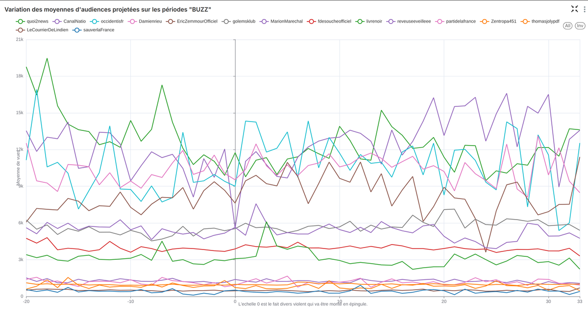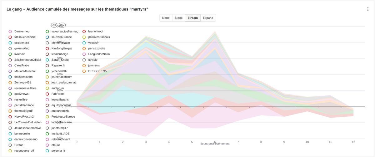 Et qu’ont-ils à y gagner ? Le graphique suivant montre les évolutions de l'audience des principaux membres du « gang ». Ceux qui en tirent les plus grands bénéfices sont « CanalNatio », « MarionMarechal », « Zentropa451 », « golemsklub », « EricZemmourOfficiel » et « occidentisfr ». Autrement dit, les plus visibles deviennent encore plus visibles.