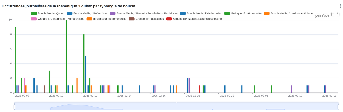 Dès le deuxième jour, la mécanique s’emballe : plusieurs boucles aux accents néofascistes ou affiliées à la sphère QAnon entrent en scène. On voit alors apparaître des comptes comme « reveuseveillee », « Zentropa451 », « LeCourrierDeLindien » ou encore « retourauvivant ». C’est aussi à ce moment-là que les grosses boucles comme « CanalNatio », « occidentisfr », « quoi2news » ou « Golemsklub » viennent injecter leur audience dans la machine.