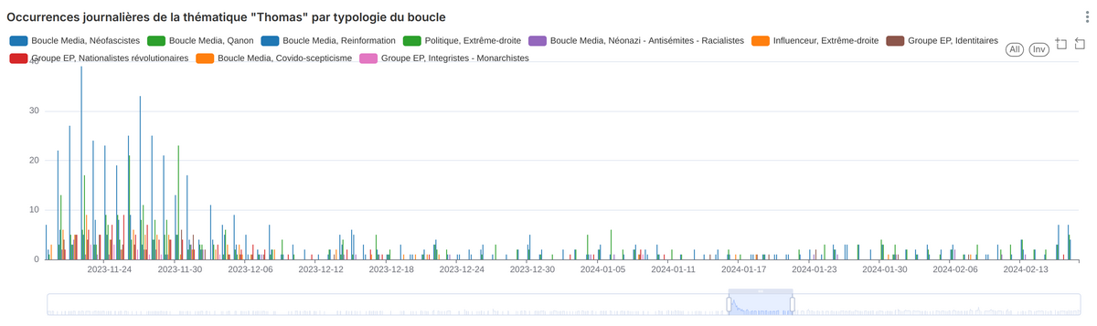 Pour faire chauffer la machine, lançons une première analyse sur la proportion des thèmes de société abordés dans les boucles d’extrême droite. En pôle position on retrouve « immigration », « justice » et « covid ». En bons derniers, on note les « vpolice-media » (affaires de violences policières médiatisées) et les « vss-media » (affaires de violences sexistes et sexuelles médiatisées). On observe également l’irruption de la question agricole en janvier 2024, à l’occasion du mouvement des agriculteurs. Une récupération à la fois réactionnaire et anti-écologiste, heureusement vite résorbée.