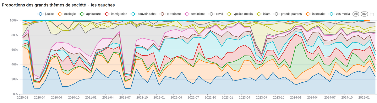 Et quand, à titre de comparaison, on tente d’analyser les thématiques sur les boucles de gauche, les courbes et l’échelle prennent des tours quelques peu différents. On notera que les « mots-clés » utilisés pour générer ces graphiques et ensembles de données portent en elles-mêmes deux polarités inhérentes aux camps politiques qu’ils caractérisent. Évidemment, des termes comme « justice », « féminisme » ou « migrants » n’auront pas du tout la même signification selon les mouvances, mettant en avant la bataille sémiologique menée par l’extrême droite, en quête d'appropriation des thématiques sociales et de dé-diabolisation.