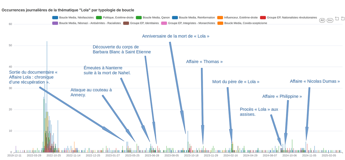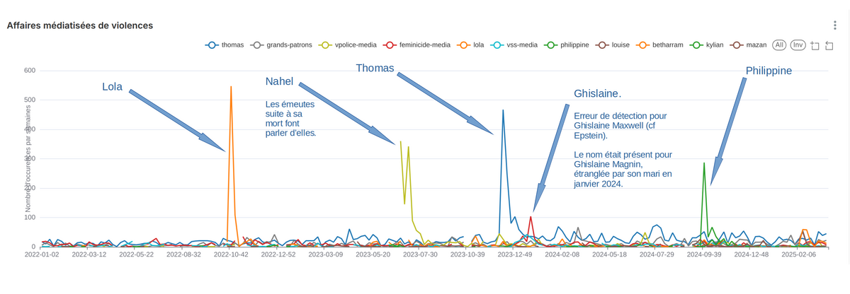 Et il faut savoir que même si ces vagues s’apaisent, elles n’ont jamais vraiment disparu. Sur l’image suivante, seul le nom « Lola » est détecté dans les messages. Et à la manière d’une litanie, le nom est rappelé à chaque nouveau fait divers.