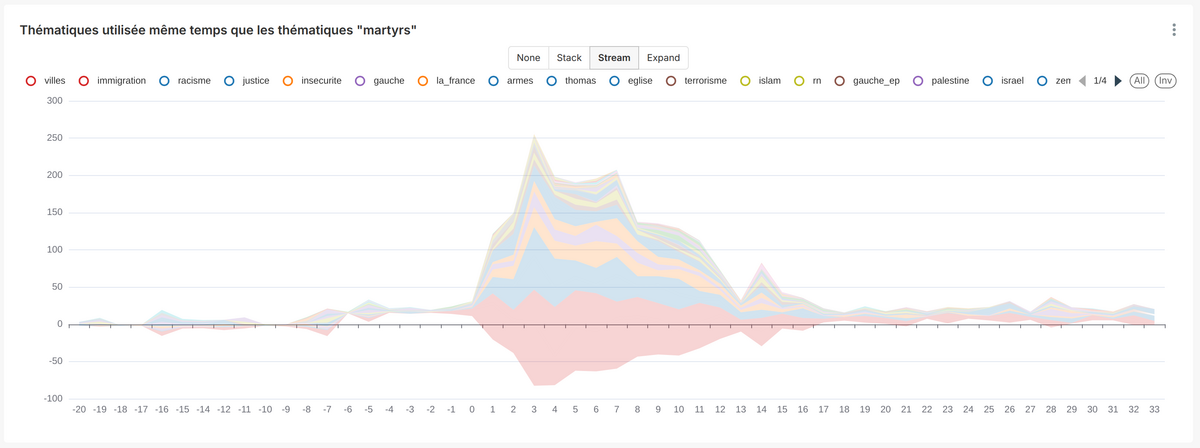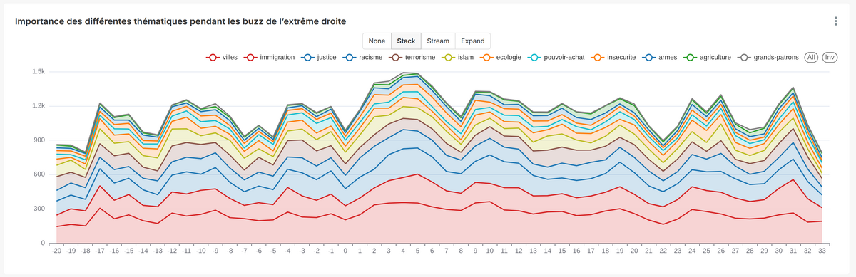 Pour l’analyse, le graphique suivant représente les thématiques abordées dans l’ensemble des messages durant la même période. On y observe une augmentation générale des courbes portée par la montée en puissance des thématiques « villes », « immigration », « justice », « racisme ».