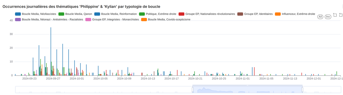 Pour l’affaire « Philippine » on observe encore les mêmes symptômes avec un premier message de « fdesoucheofficiel » le 22 septembre 2024 à 12:42. Dans la journée, puis le lendemain l’affaire commence à être reprise par la boucle QAnon « reveuseeveillee », le « Parti de la France » et son président « Thomas Joly ». Le surlendemain la mèche est allumée et tourne dans les fils néofascistes avec une reprise par « MarionMarechal » et « DamienRieu ».