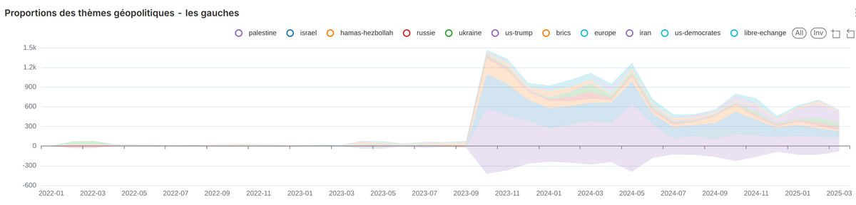 Une fois de plus, à gauche, on se concentre sur d’autres priorités. Les thématiques internationales semblent peu prioritaires jusqu'à l'automne 2023 où apparaissent les boucles média de soutien à la Palestine.