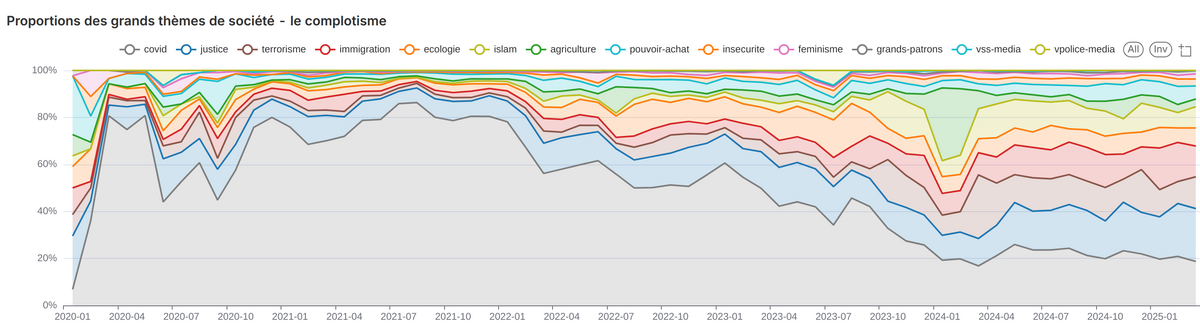 Quand on se penche sur la mouvance « complotiste », on retrouve, sans surprise, une thématique « Covid » extrêmement développée. Passé ce premier constat, et dans la période post-2023, on remarque que les courbes du complotisme et de l’extrême droite deviennent relativement semblables, une similarité qui se constate dans l’ordre des thématiques dans l’échelle. Cette « similarité » ne sort pas de nulle part. En 2022, alors que les réseaux complotistes sont encore en pleine puissance, beaucoup de leurs acteurs appellent à voter pour Marine Le Pen lors de l’élection présidentielle. Le collectif L’Extracteur avait, à l’époque, minutieusement tracé leurs réseaux et leurs alliances.