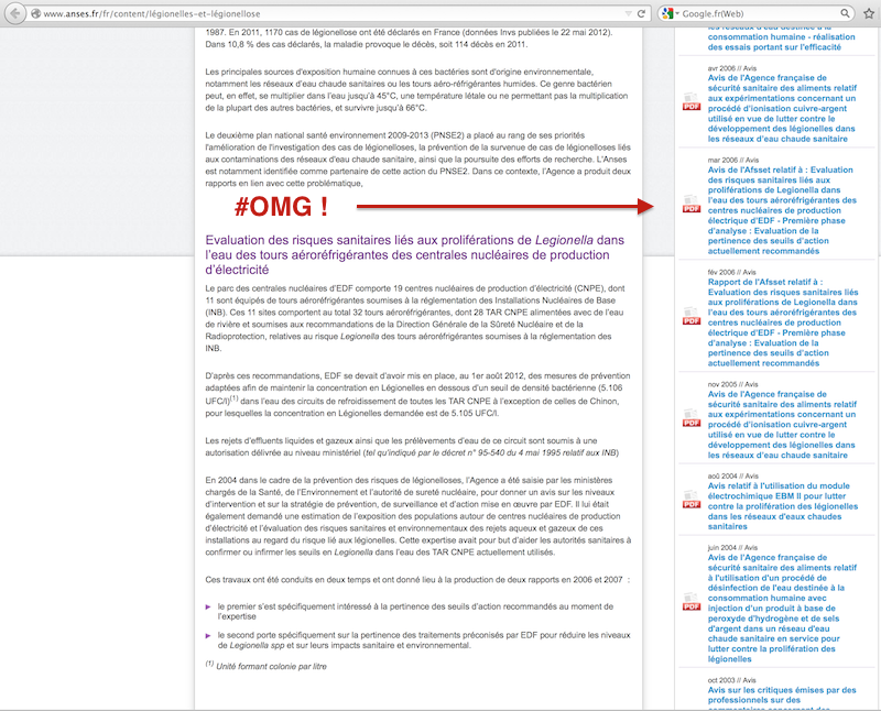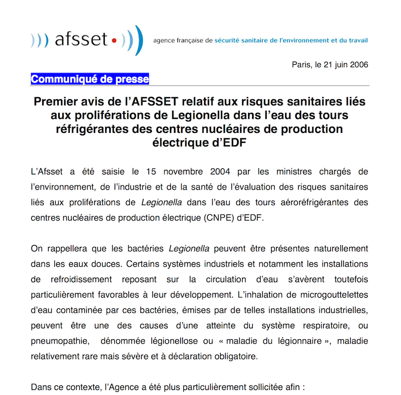 Mais ce n'est pas tout, on retrouve ces documents sur le site de l'Afssa, l'ancien nom de l'ANSES. L'Afssa avait même fait un communiqué de presse à l'occasion de la publication de ce rapport sur la légionellose et les centrales nucléaires :